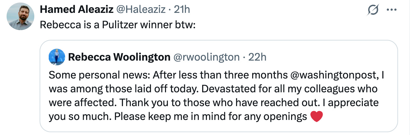 Last night, I saw a deluge of tweet after tweet from brilliant and dedicated Washington Post journalists, editors, photographers. From the war reporter sacked while in a war zone:
