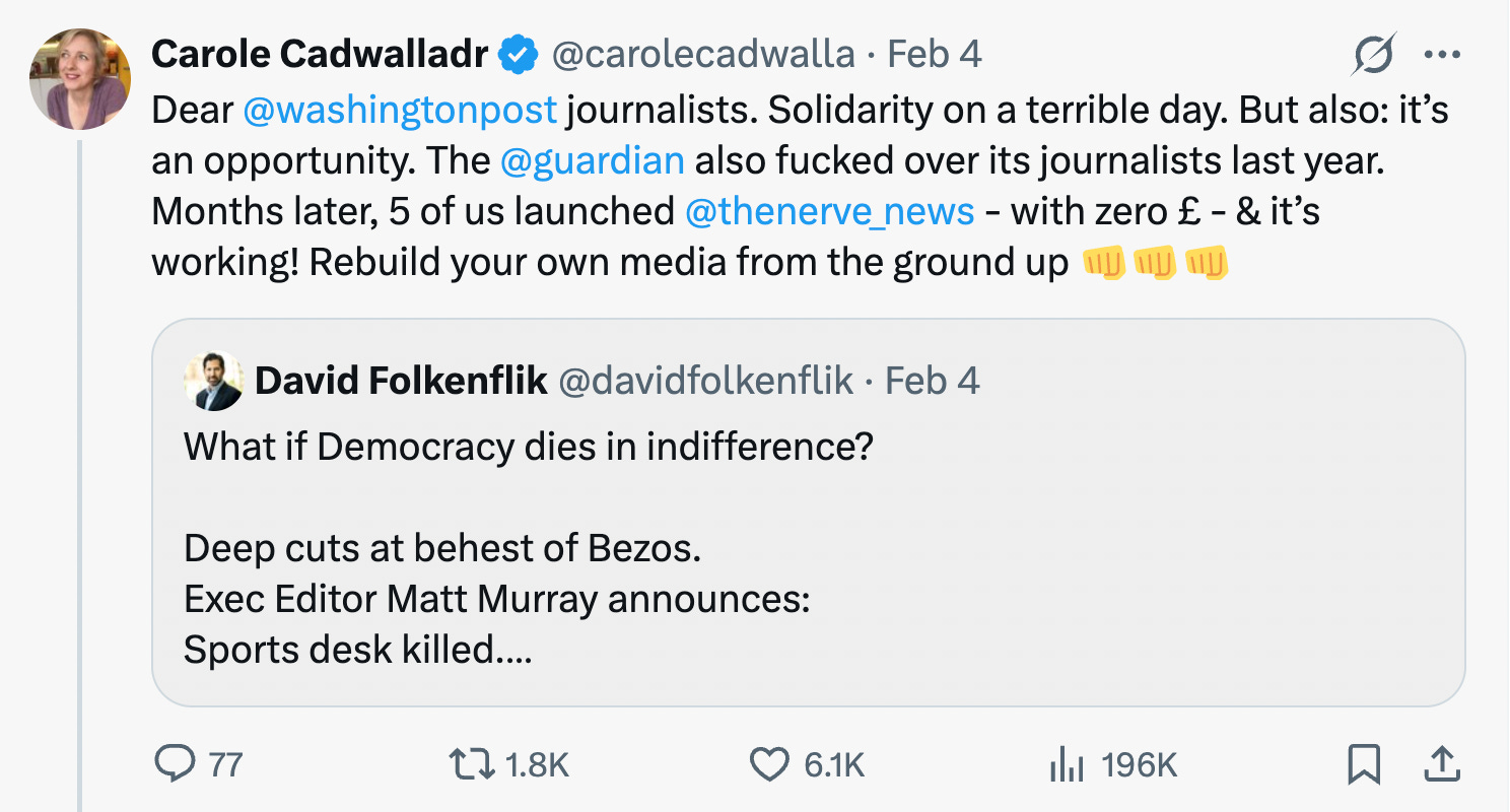 It's hard to watch as the Tech Broligarchy raze some of the US's most venerable media institutions but, given what's happening there right now - it's not unexpected. Large corporate media is (and I think, with a couple of exceptions, always was) beholden to the whims of its billionaire owners. However, as you're starting to prove with The Nerve, with disappointment comes opportunity. the future of independent and meaningful 4th Estate accountability is in new forms of publication such as the Nerve and Byline Times. Thanks Carole.