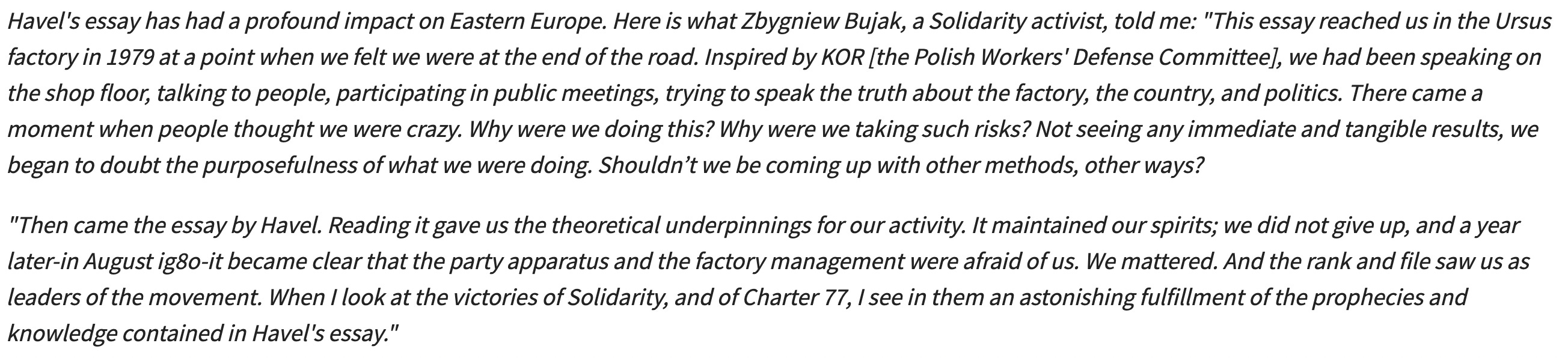 That’s one of the central points of Havel’s essay. And also the outcome of it. After its publication in 1978, his idea that “living in truth” was both a radical and an achievable act reverberated across Eastern and Central Europe. This account, published by the Hannah Arendt Center for Politics and Humanities, describes its direct galavanizing impact on Polish factory workers: